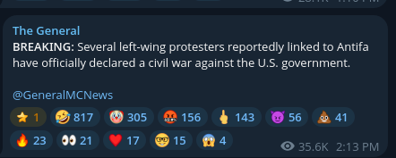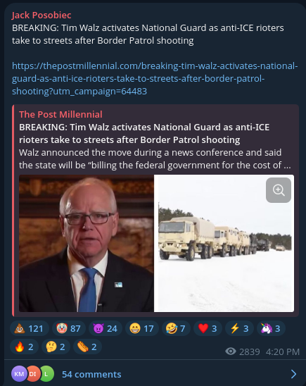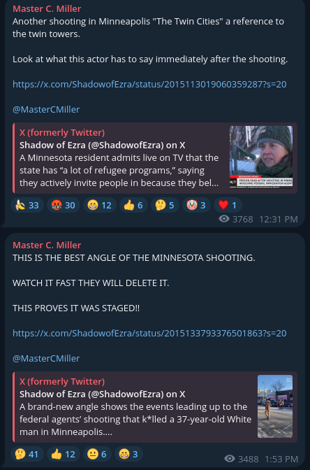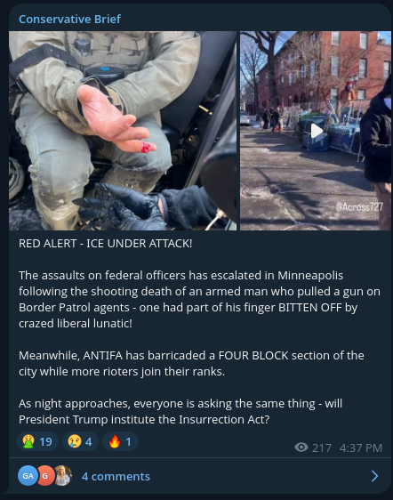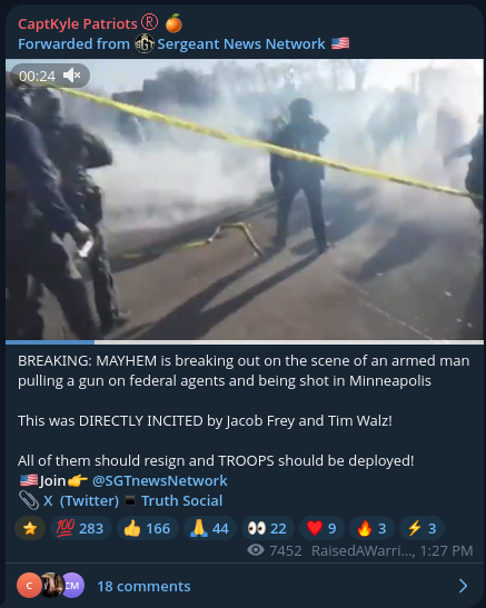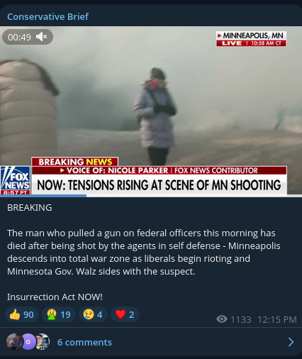 Some of the initial responses to the shooting on conservative Telegram channels.