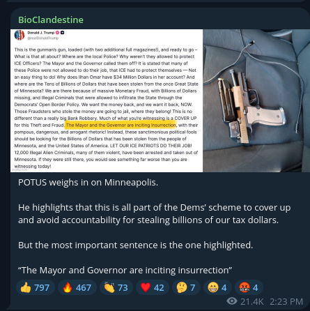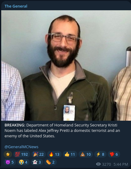 I typed "s" into firefox just now, and it auto-filled "shooting in Minneapolis". It's hard to tell which shooting generated this development; but as the New York Times (and everyone else) reports, a 37-year-old registered nurse by the name of Alex Pretti was murdered by ICE today.